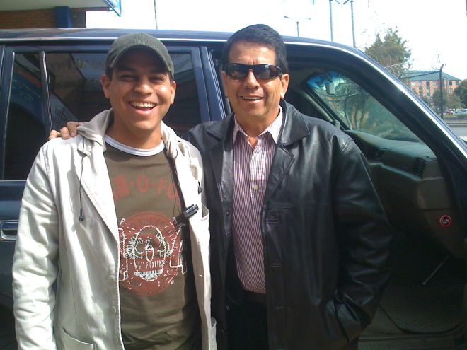 El Pastor Modesto visitando una obra en Bogota haciendo trabajo misionero con la Iglesia Centro Biblico Internacional en sus 10 años de aniversario. El Pastor Modesto fue invitado como conferencista de inauguracion. A la derecha, el hermano Yepes, quien crecio en su vida cristiana en la sede principal del Centro de Fe y Esperanza en Cali.